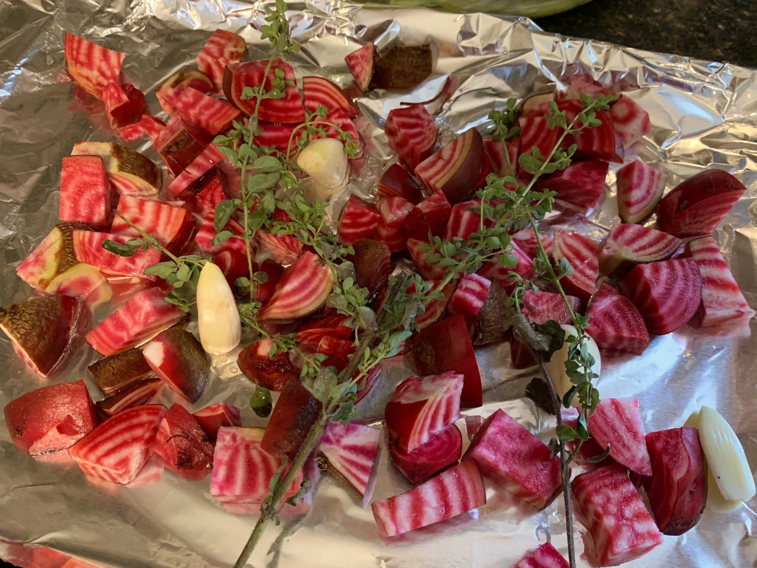 Cut the beets into small bite size pieces. Coat them in Olive Oil and add a pinch of salt and pepper. Add a few springs of lemon thyme and throw it into the oven at 350 F for 45 minutes. Give them a nice toss at the twenty minute mark.